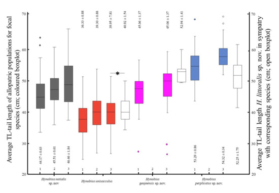 Impact of patry on the morphologies of sympatric populations. Box plots representative of the variation in tail length, as a proxy for PC1—being the only significantly different PC between clades when looking at patry independently. Here, Hynobius notialis sp. nov. is used as reference, as it is the only species sympatric with three other species in parts of its range. The ranges of values for the three clades overlapping with H. notialis sp. nov. were different when not in sympatry with H. notialis sp. nov. On the x-axis, (1) refers to all individuals of the species, (2) to allopatric populations and (3) to populations sympatric with H. notialis sp. nov. The asterisk indicates significant difference under the Tukey test (Table 8). Values either below or above the box plots are mean ± SD. Box plots follow the earlier species-specific colour coding.
