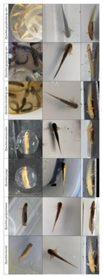 Pictures of representative eggs and larvae. We compared the general anatomy of eggs and larvae for each species of the genus on the Korean Peninsula. Eggs were photographed between stages 29 and 37, while the embryo was still in the egg sac. Larvae were then photographed between stages 40 and 49, when the larvae was free swimming with balancers, and between stages 50 and 59, when the hind legs of the larvae were developing.