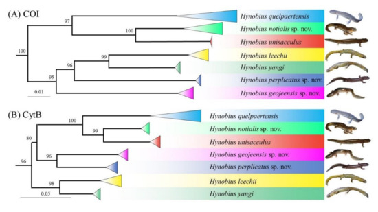 Phylogenetic tree of Hynobius sp. from the Korean peninsula. (A) Tree based on the COI gene fragment, modified from Min et al. (2016). (B) Tree based on the CytB gene fragment, modified from Suk et al. (2019).