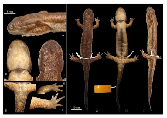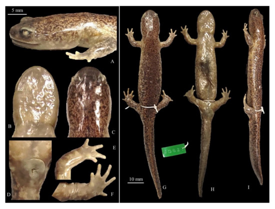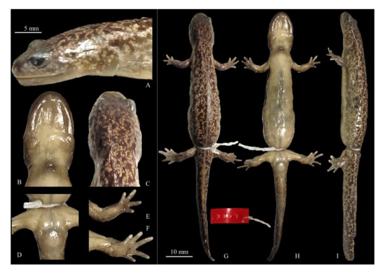 Details and holotype for Hynobius notialis sp. nov. Voucher CGRB15873 (field ID mms3897); adult collected on 14 March 2012 in Jangmok-myeon, Geoje-si, South Gyeongsang Province, Republic of Korea (34.986877° N, 128.682033° E). (A) Head in lateral view; (B) head in ventral view; (C) head in dorsal view; (D) ventral view of vent; (E) plantar view of the left hand; (F) plantar view of the left foot; (G) dorsal view; (H) ventral view; (I) lateral view. (A–F) match with the 5 mm scale bar and (G–I) match with the 10 mm scale bar. Measurements and counts in Table 9.