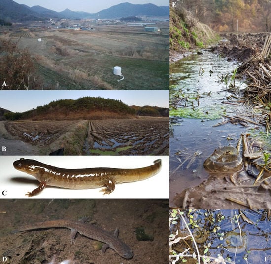 - Bae, Y.; Kong, S.; Yi, Y.; Jang, Y.; Borzée, A. Additional threat to Hynobius salamander eggs: Predation by loaches (Misgurnus sp.) in agricultural wetlands. Anim. Biol. 2019, 69, 451–461. [Google Scholar] [CrossRef]