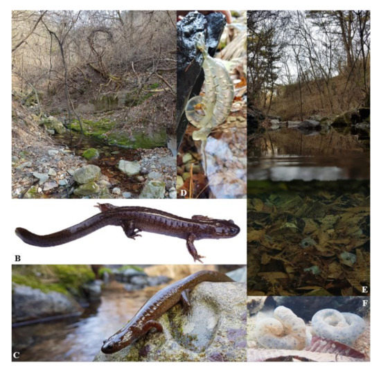 Representative habitat in life adult, and larvae and eggs for Hynobius notialis sp. nov. (A) Habitat during the breeding season (35.095278° N, 128.329167° E on 21 February 2020). (B) Habitat during the breeding season (35.133889° N, 128.223333° E on 18 March 2020). (C) Adult in situ setting from site (B). (D) Adult at site (A). (E) Eggs emerged from the water at breeding site (B) following drought at the site. (F) Sites in situ at site (B).