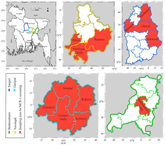 Geographical map of Bangladesh showing the locations of the sampling areas in selected districts in the present study. Areas where the colistin resistance gene mcr-1 was screened are highlighted in red.