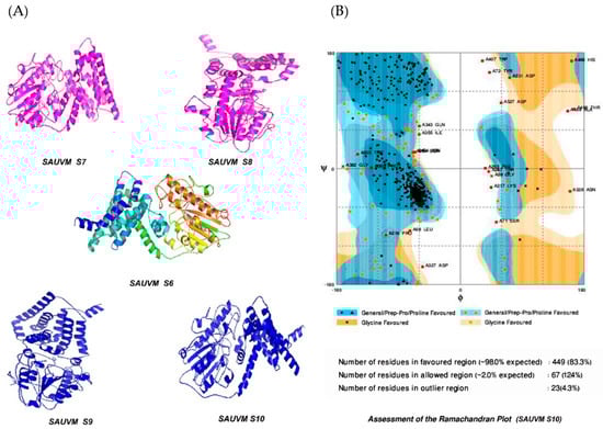 Modelled structures of Salmonella SAUVM MCR-1 proteins and validation. (A) Three dimensional (3D) modeling of Salmonella SAUVM MCR-1 proteins (SAUVM S6 to SAUVM S10) were performed using I-TASSER, which functions by identifying structure templates from the PDB library. The confidence of each model was quantitatively measured by C-score. From these models of MCR-1 proteins, the Salmonella SAUVM S10 model was randomly selected, (B) analyzed and structurally validated with the Ramachandran plot assessment server (RAMPAGE).