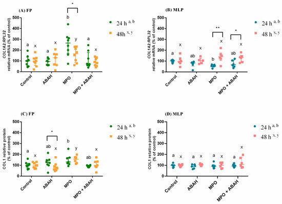 Relative mRNA transcription of type I collagen (COL1A2) (A,B) and relative abundance of COL1 protein (C,D) in mare endometrial explants from the follicular phase (FP) and the mid-luteal phase (MLP) treated with culture medium only (Control), myeloperoxidase (MPO: 0.5 μg/mL), 4-aminobenzoic hydrazide (ABAH: 10 μg/mL), or MPO (0.5 μg/mL) + ABAH (10 μg/mL) for 24 or 48 h. Results are presented as median with interquartile range. Significance was determined at p < 0.05. The differences among treatments with the same treatment time are signaled by distinct superscript letters (a,b—24 h; x,y—48 h). The differences among times of treatment for the identical treatment are shown by asterisks (* p < 0.05; ** p < 0.01).