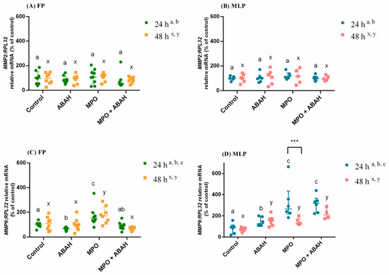Transcription of MMP2 (A,B) and MMP9 (C,D) relative mRNA in mare endometrial explants from the follicular phase (FP) and the mid-luteal phase (MLP) treated with culture medium only (Control), myeloperoxidase (MPO: 0.5 μg/mL), 4-aminobenzoic hydrazide (ABAH: 10 μg/mL), or MPO (0.5 μg/mL) + ABAH (10 μg/mL) for 24 or 48 h. Results are presented as median with interquartile range. Significance was determined at p < 0.05. The differences among treatments with the same treatment time are signaled by distinct superscript letters (a,b,c—24 h; x,y—48 h). The differences among times of treatment for the identical treatment are depicted by asterisks (*** p < 0.001).