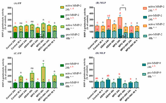 The MMP-9 active form gelatinolytic activity was only identified in FP at 48 h treatment, and MPO treatment up-regulated it compared to the control group (p < 0.01; Figure 3C). Nevertheless, MPO + ABAH combination reduced the activity of active MMP-9, with respect to MPO-treated explants (p < 0.01; Figure 3C; Supplementary Material Figure S3). The analysis of pro-MMP-9 gelatinolytic activity showed its decrease after MPO + ABAH of MLP explant treatment for 24 h compared to MPO-treated explants (p < 0.05; Figure 3D), which did not differ from its respective control.
