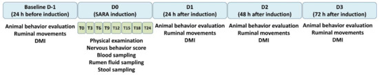 The animals were evaluated for a total period of five consecutive days: day zero (D0), which was the SARA induction day, and 4 days of behavioral evaluations, which comprised 1 day before (D-1) and 3 days after the induction (D1, D2, and D3) (Figure 1). On D0, the physical examination of the animals as well as rumen content, feces, urine, and blood sample collections were performed at the following time points: T0 (baseline moment before induction), T3, T6, T9, T12, T15, T18, and T24 (3, 6, 9, 12, 15, 18, and 24 h after induction, respectively). Meanwhile, during the physical examination, the following variables were measured: heart rate (HR), respiratory rate (RR), rectal temperature (T), and ruminal movement [17]. During D0, the animals were also evaluated for the degree of nervous behavior exhibited during SARA induction, according to Danscher et al. [18], with scores of 1, 2, 3, and 4 assigned to represent a dying animal, a very depressed animal, a slightly depressed animal, and an alert and responsive animal, respectively.