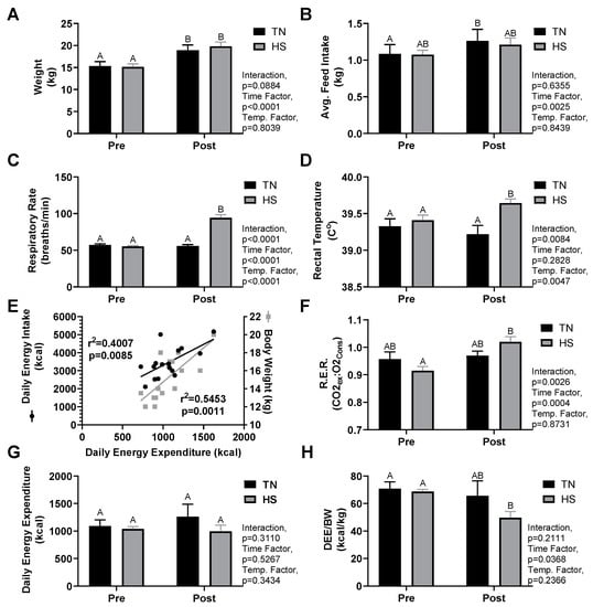 Statistical analyses were performed using PRISM software (Prism version 8.0.0 for Windows, GraphPad Software, La Jolla, CA, USA). Correlations were performed using simple liner regression with an F-test used to determine statistical significance. Pre/post treatment measures (weight, RER, DEE, and metabolic measures) vs. treatment (TN/HS) were analyzed through repeated measures two-way ANOVA. Periodical measurements (feed intake, rectal temperatures, and respiratory rates) were analyzed using a restricted maximum likelihood (REML) mixed-effect analysis with repeated measures, where values are reported as the average within acclimation or treatment periods. Tukey and Sidak’s post hoc analyses determined environmental effects within timepoints and time effects within treatments, respectively. Pig variance was included as a random variable. The model included the treatment (TN and HS) and treatment-by-time point interaction. Data are reported as mean ± SEM and were considered significant at p < 0.05 and defined as a trend if >0.05 but <0.10.