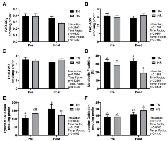 Effect of environmental conditions on growing pigs for measures of complete fatty acid oxidation (FAO-CO2) (A), acid soluble metabolites (incomplete oxidation) (FAO-ASM) (B), total-FAO (FAO-CO2 + FAO-ASM) (C), metabolic flexibility (pyruvate oxidation:pyruvate oxidation +100 µM palmitic acid) (D), pyruvate oxidation (E), and leucine oxidation (F). Pigs were acclimated under thermoneutral conditions (14 h light/10 h dark, 21.6 ± 0.8 °C, with humidity 46–64%) for five days prior to treatment (Pre). Pigs were then randomly assigned (n = 8 per group) to thermal neutral (TN, 22.0 ± 0.4 °C, with humidity 43–63%) or heat stress (HS, 33.6 ± 0.5 °C, with humidity 22–40%) treatment groups for five days (Post). Means without a shared letter are significantly different, p < 0.05.