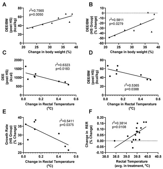 Relative energy expenditure post HS was correlated to growth (r2 = 0.77, p < 0.01, Figure 3A). Reductions in energy expenditure per body weight due to HS were also correlated to growth (r2 = 0.58, p = 0.03, Figure 3B), with the pigs who experienced the greatest decrease in energy expenditure per body weight also experiencing the smallest growth. DEE (r2 = 0.63, p = 0.02, Figure 3C) and DEE/BW (r2 = 0.54, p = 0.04, Figure 3D) of HS animals were negatively correlated with change in rectal temperature where pigs with the greatest increases in rectal temperature due to HS presented with lower rates of exergy expenditure post HS. Changes in rectal temperature were also negatively correlated with growth rates (r2 = 0.54, p = 0.04, Figure 3E), such that pigs with the greatest increases in core temperature exhibited the slowest rates of growth. A positive relationship between change in RER and change in rectal temperature is seen when both TN and HS groups were analyzed together (r2 = 0.38, p = 0.01, Figure 3F).