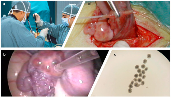 - Tervit, H.R. Laparoscopy/laparotomy oocyte recovery and juvenile breeding. Anim. Reprod. Sci. 1996, 42, 227–238. [Google Scholar] [CrossRef]