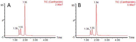 Chromatogram of cantharidin in blister beetle in the sample, spiked at the limit of quantification (LOQ) of 0.6 ng/mg (A) and in the positive beetle sample of Mylabris variabilis (concentration was above or equal to LOQ) (B). The retention time of cantharidin was at 1.95 min.