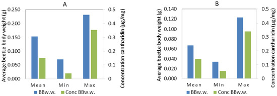 Graphical discriptive statistics for blister beetle wet body weight (BBw.w., blue bars) and concentration of cantharidin per Bw.w. (Conc BBw.w., green bar) in blister beetles: (A) M. variabilis (n = 17) and (B) Epicauta rufidorsum (n = 36). Mean: average value; Min: minimum value, Max: maximum value.
