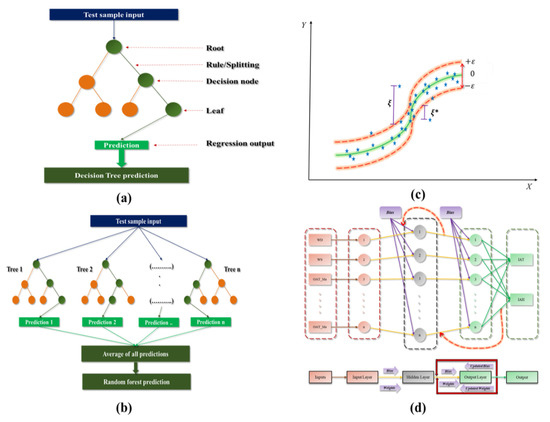 Important parameters and operational blue print of (a) Decision tree regression model, (b) Random forest regression model, (c) Support vector regression model, (d) Multilayered perceptron—Back propagation model.