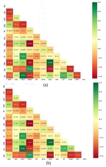 As mentioned in the sensor data part, the outdoor and indoor variables were collected from the computerized sensors and it is explained along with mean ± standard deviation, standard error, and minimum and maximum values in Table 1. It has been reported that recording every meteorological parameter is complicated due to the unavailability or uncertainty of the sensor’s measurements. In this study, three different input datasets named S1, S2, and S3 were used to assess the models, which are illustrated in Table 2. To achieve the desired accuracy, it is essential to generate a reference for selecting the parameters that need to be recorded. The current study considers the use of different datasets as a useful method to ascertain the appropriate data that may have fewer variables and significant implications for predictions indeed [20,21,36,37]. So that the current study adopts the Spearman rank correlation coefficient approach in order to extract the best features, which is a commonly followed method to explore the relationships between attributes. Such correlation test aids to describe whether the relationship between independent and dependent factors are strong or not. Having a strong relationship, those independent attributes can be considered as a strong predictor of dependent attributes. The heat correlation results between IAT and IRH with other independent variables were showed in Figure 4. According to the rank correlation tests, the high correlated attributes were selected and used as dataset S3. The current study considers that ±0.5 as the high correlation value to choose as the S3 input set.
