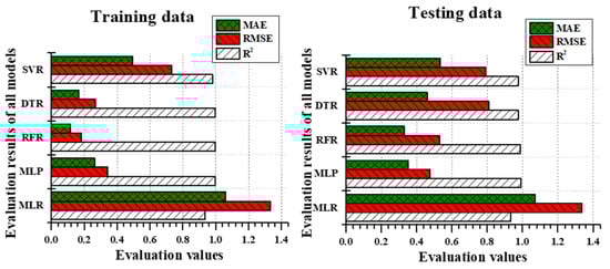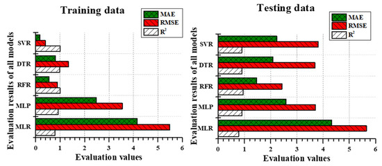 In IRH predictions, the training results followed a similar pattern as IAT predictions. As like IAT training results, other models than MLR followed by MLP predicted IRH adequately. The RMSE results of RFR, DTR, and SVR were less than 1.5%, whereas MLP and MLR, respectively were 3.54 and 5.49, which were considerably high. Likewise, the MAE results were also high in MLR and MLP while in the training period. From the reference of Table 5, SVR performed better outcomes during the training phase, and the testing results were poor (R2 = 0.9; RMSE = 3.8161; MAE = 2.2302). Compared to the training and testing deviations of RFR, a considerable difference was noticed (92% high in MAE, 149% high in RMSE, and 10% less in R2). Even though the MLR and MLP performed poor outcomes, the difference between training and testing accuracy was not significant (MLR and MLP results followed by 4% and 4.15% was high in MAE; 2.8% and 4.3% was high in RMSE; 2.16% and 1% was low in R2). The compression of evaluation metrics between models are clearly illustrated in Figure 7.