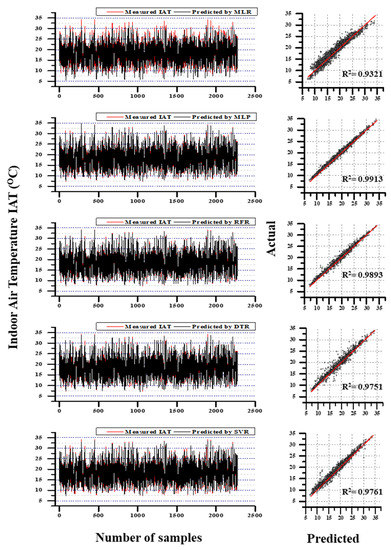 The comparison results between actual and simulated by MLR, MLP, RFR, DTR, and SVR with S3 for IAT prediction; the coefficient of determination between actual and predicted for all the models.