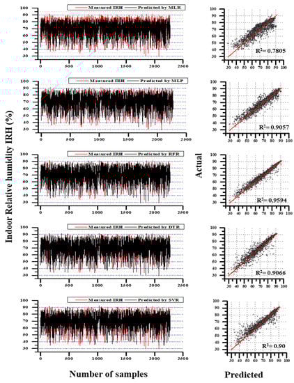 The comparison results between actual and simulated by MLR, MLP, RFR, DTR, and SVR with S3 for IRH prediction; the coefficient of determination between actual and predicted for all the models.