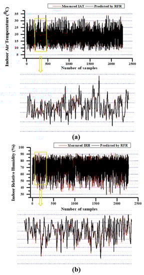 Likewise, IRH’s evaluation results (refer Table 5) illustrated that RFR performed better results (R2 = 0.9594; RMSE = 2.429; MAE = 1.4708) during the testing phase. Unlike IAT prediction performance, the models performed comparably less than the high-performance model. RFR, DTR, and SVR models produce better results during the training time, yet testing results are non-reliable except for RFR prediction. For instance, SVR’s training accuracy was better than RFR (MAE was 69.5% less, RMSE was 56% less, and R2 was 0.4% high); however, it was lagged to make reliable predictions using test data. When considering the R2 between SVR and RFR, 6% was still on a colossal scale to negate. Thus, all models except RFR have created a baffling circumstance to scale the stability. The performance of MLP models, which was considered the best performer in IAT predictions, was also turned to contradict during IRH predictions. The overall comparison between actual IRH values and predicted values along with the coefficient of determination values are illustrated in Figure 9. The comparison results between actual and simulated by RFR with S3 for IAT prediction IRH prediction including the zoomed view (randomly selected) from the simulation results are illustrated in Figure 10. However, according to the prediction result, DTR, MLP, SVR, MLR retained 2nd, 3rd, 4th, and 5th places, respectively. Compared to the RFR’s outcomes, DTR was 42% high in MAE, 51.8% high in RMSE, and 5.5% less in R2; MLP was 75.7% high in MAE, 52.5% high in RMSE, and 5.6% less in R2. The SVR was 51.6% high in MAE, 57% high in RMSE, and 6% low in R2; MLR was 194.5% high in MAE, 123% high in RMSE, and 17.8% low in R2. The aforementioned percentage differences were calculated from the high-performed model.