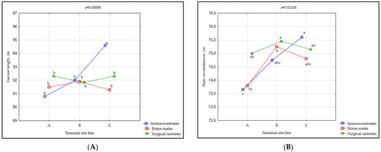 (A) Terminal sire line (TSL) by male category (MC) interaction for carcass length (os pubis—1st rib) and ham circumference (B). Terminal sire line A = Pietrain × Large White; Terminal sire line B = pure Pietrain; Terminal sire line C= Pietrain × Duroc × Large White. Significant differences (p < 0.05) between groups are denoted by different lowercase letters (a, b, c).
