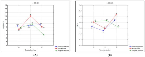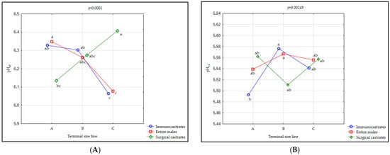 The interaction between immunocastrates (IC), entire males (EM) and surgical castrates (SC) originating from different terminal sire lines. (A) and pH24 in LD muscle (B). Terminal sire line A = Pietrain × Large White; Terminal sire line B = pure Pietrain; Terminal sire line C= Pietrain × Duroc × Large White. Significant differences (p < 0.05) between groups are denoted by different lowercase letters (a, b, c).