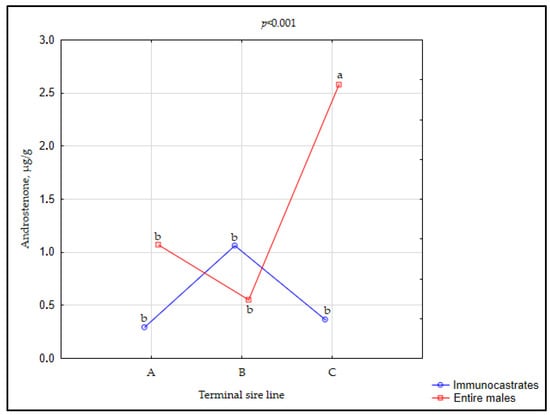 A significant interaction between MC and TSL existed for the androstenone level (Figure 4). EM from TSL C had higher androstenone levels than entire males from the other two sire lines, but such breed dependence was not observed among IC animals.