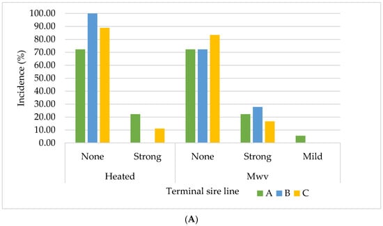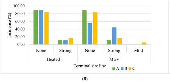 The incidence of boar taint odour of the (A) immunocastrates and (B) entire males samples originating from three terminal sire lines using hot water (heated) and microwave (mwv) method.