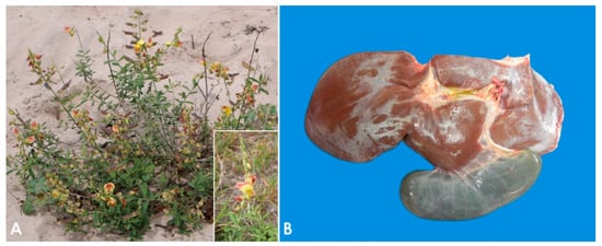 Pyrrolizidin alkaloid poisoning. (A) Crotalaria retusa plant. Inset: Detail of the flower. (B) Liver, sheep. Seneciosis. Moderately shrunken liver, with multifocally thickened Glisson’s capsule and distended gall bladder (Photo courtesy of Dr. Paula Giaretta).