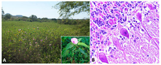 Swainsonine-containing plant poisoning. (A) Ipomoea carnea subsp. fistulosa-invaded area. Inset: Detail of the plant and flower. (B) Cerebellum, sheep. Slight cytoplasmic vacuolization of Purkinje cells.
