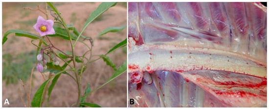 Sheep grazing calcinogenic plants develop a progressive debilitating disease with widespread mineralization of soft tissues called enzootic calcinosis. The main species of calcinogenic plants that affect sheep are Cestrum diurnum in southern United States [], Trisetum flavescens in Bavarian and Austrian Alps [,], Solanum malacoxylon (Figure 3A) in Argentina and Uruguay [], Solanum escuriali in Australia [], Solanum verbascifolium in South Africa [], Nierembergia veitchii in Brazil [,], and Nierembergia repens and Nierembergia rivularis in Uruguay []. In some countries such as Israel, India and Central Western Brazil, outbreaks caused by undetermined calcinogenic plants occurred in sheep [,].