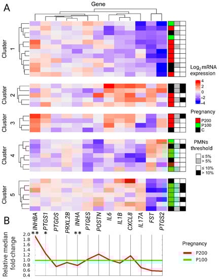 (A) Heat map of mRNA expression divided into 5 clusters. Cows with a similar expression pattern of marker genes were cluster together. Belonging to the pregnancy group, the 5% and 10% SE thresholds are presented next to the heatmap for each cow (row). (B) Median mRNA expression fold-change relative to the P100 group. * p < 0.05, ** p < 0.01.