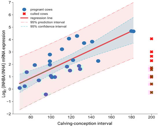 Linear regression model for calving conception interval prediction (INHBA/INHA ratio).