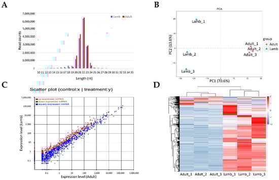 miRNA expression analysis of the ovaries of lamb and adult sheep under superovulation treatment. (A) Sequence length distribution for miRNA sequencing. (B) Principal component analysis (PCA) of expression of miRNA values in the lamb and adult sheep libraries. (C) Screen of differentially expressed miRNAs. (D) Heat map analysis of differentially expressed miRNAs.
