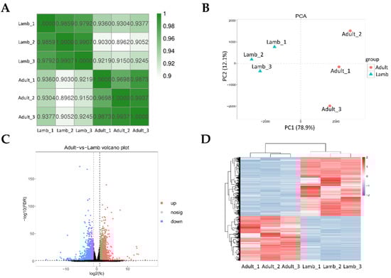 mRNA expression analysis for the ovaries of lambs and adult sheep under superovulation treatment. (A) Pearson correlation for mRNA expression values across samples. (B) PCA of mRNA expression values of the lamb and adult libraries. (C) Volcano plot of distribution for differentially expressed mRNAs. (D) Heat map analysis of differentially expressed mRNAs.