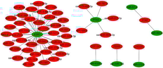 miRNA–mRNA expression regulatory network related to genes associated with the hormone receptor, steroid hormone secretion, and oocyte quality. Molecules in red and green denote upregulation and downregulation in the lamb libraries, respectively.