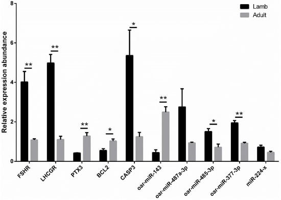 The expression levels of five miRNAs (oar-miR-143, miR-224-x, oar-miR-377-3p, oar-miR-485-3p, and oar-miR-487a-3p) and five mRNAs (FSHR, LHCGR, PTX3, BCL2, and CASP3) were validated in the ovaries of lambs and adult sheep using real-time PCR (Figure 4). In these selected molecules, FSHR was targeted by oar-miR-143 [34,36], and PTX3 was targeted by miR-224-x, oar-miR-377-3p, oar- oar-miR-485-3p, and miR-487a-3p [37]. mRNA and miRNA expression values from each sample, detected by high-throughput sequencing and real-time PCR were used for Pearson correlation analysis (Supplementary File 12). The correlation coefficients of the two methods in expression detection of the 10 selected molecules ranged from 0.635 to 0.978, which demonstrates that the expression levels detected by high-throughput sequencing were reliable.