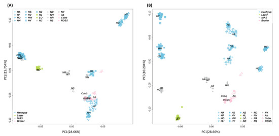 Multi-dimensional scaling (MDS) plots based on 600k SNP genotype data. (A) An explanatory power of 44.414% was achieved by using the PC1 (principal component 1) and PC2 dimensions, and (B) that of 38.864%, using the PC1 and PC3 dimensions. NC, Rhode Island Red C; ND, Rhode Island Red D; NH, Cornish H; NS, Cornish S; NR, Red Korean native chicken; NY, Yellow Korean native chicken; HH, Hanhyup H; HF, Hanhyup F; HY, Hanhyup Y; HW, Hanhyup W; HS, Hanhyup S; HG, Hanhyup G; HV, Hanhyup V; HA, Hanhyup A; HZ, Hanhyup Z; Ab, Arbor Acre; Cobb, Cobb broiler; Ross, Ross broiler; LO, Lohmann brown; HL, Hyline brown.