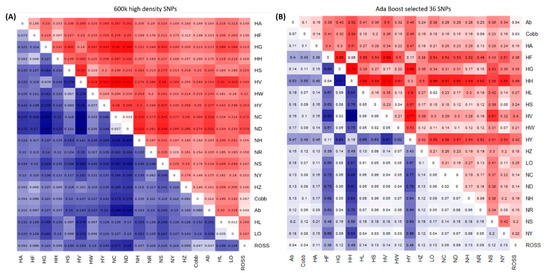 Heatmap showing the genetic distance and fixation index (Fst) results. Genetic distances are shown in blue, and Fst values are shown in red. (A) High-density SNPs had reasonable genetic distances and Fst values in their genetic relationships. (B) The selected marker combination with 36 SNPs had relatively large genetic distances between the target (case) population and other (control) chicken populations. NC, Rhode Island Red C; ND, Rhode Island Red D; NH, Cornish H; NS, Cornish S; NR, Red Korean native chicken; NY, Yellow Korean native chicken; HH, Hanhyup H; HF, Hanhyup F; HY, Hanhyup Y; HW, Hanhyup W; HS, Hanhyup S; HG, Hanhyup G; HV, Hanhyup V; HA, Hanhyup A; HZ, Hanhyup Z; Ab, Arbor Acre; Cobb, Cobb broiler; Ross, Ross broiler; LO, Lohmann brown; HL, Hyline brown.