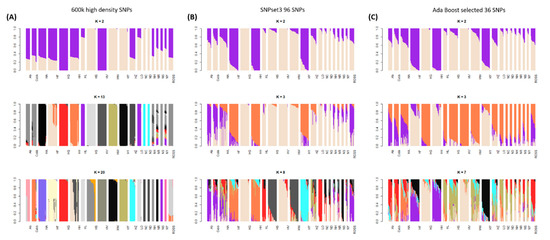 Admixture results using the data from 600 k SNPs, selected 96 SNPs, and selected 36 SNPs, to identify the genetic components of the chicken population. (A) The genetic component of the 20-chicken population was identified as 12 components, through cross-validation (CV) error analysis. (B) 50-LD pruned 96 SNPs confirmed k = 8 as optimum CV error and (C) 36 SNPs by feature-selection function of AdaBoost model detected two of optimum CV errors for the classification of targeted chickens. NC, Rhode Island Red C; ND, Rhode Island Red D; NH, Cornish H; NS, Cornish S; NR, Red Korean native chicken; NY, Yellow Korean native chicken; HH, Hanhyup H; HF, Hanhyup F; HY, Hanhyup Y; HW, Hanhyup W; HS, Hanhyup S; HG, Hanhyup G; HV, Hanhyup V; HA, Hanhyup A; HZ, Hanhyup Z; Ab, Arbor Acre; Cobb, Cobb broiler; Ross, Ross broiler; LO, Lohmann brown; HL, Hyline brown.