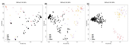 The optimal marker combination used to distinguish the case group (HH, HF, and HY) from the other chicken groups, considering population linkage disequilibrium (LD). (A) SNPset1 result using 96 SNP markers with high p-values produced in the association analysis, without considering the LD in the chicken population. (B) SNPset2 result using 96 SNPs that had undergone 1-LD pruning. (C) SNPset3 result using 96 SNPs that had undergone 50-LD pruning. The best marker combination for distinguishing between the case and control groups was SNPset3. HH, Hanhyup H; HF, Hanhyup F; HY, Hanhyup Y; other, all other chicken populations.