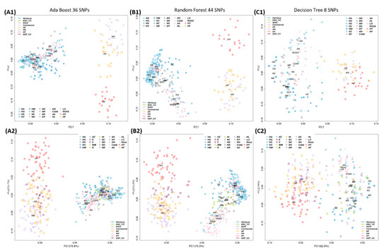 Classification results using marker combinations with the minimum number of SNPs (36, 44, and 8, respectively) selected by the feature-selection function of AdaBoost, Random Forest, and Decision Tree machine learning algorithms. (A1,B1,C1) Classification results using Sample Set 1 (selected markers). (A2,B2,C2) Classification results using Sample Set 2 (validation samples) after Sample Set 1 was used as training data. In the verification stage, the best-fitting models were the AdaBoost and Random Forest models. The minimum number of markers was set as 36 in the AdaBoost model. NC, Rhode Island Red C; ND, Rhode Island Red D; NH, Cornish H; NS, Cornish S; NR, Red Korean native chicken; NY, Yellow Korean native chicken; HH, Hanhyup H; HF, Hanhyup F; HY, Hanhyup Y; HW, Hanhyup W; HS, Hanhyup S; HG, Hanhyup G; HV, Hanhyup V; HA, Hanhyup A; HZ, Hanhyup Z; Ab, Arbor Acre; Cobb, Cobb broiler; Ross, Ross broiler; LO, Lohmann brown; HL, Hyline brown.