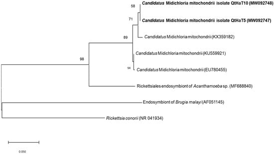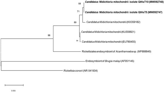 Candidatus M. mitochondrii, an α-proteobacterial symbiont first detected in Ixodes ricinus, has a unique intramitochondrial lifestyle []. It was the first bacterium shown to reside within the mitochondria and the possible role in ticks is yet to be determined []. In the present study, Candidatus M. mitochondrii was detected in H. aegyptium ticks collected on T. graeca from Qatar. As far as we know, this is the first report of the detection of this symbiont in H. aegyptium ticks.