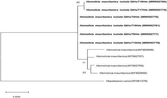 Molecular Hemolivia mauritanica identification according to phylogenetic analysis using the maximum likelihood method and Hasegawa-Kishino-Yano model with the 18S rRNA gene. The analyzed sequences are in bold. The accession numbers for nucleotide sequences from GenBank are presented with species names. The branch numbers mean bootstrap support (1000 replicates). The tree is drawn to scale, with branch lengths measured in the number of substitutions per site.