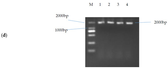 PCR amplification results of TLR4 gene in Yak. (a) Yak TLR4 alternative spliceosome’s amplification using primer P1. Note: M: DL-2000 NDA (DeoxyriboNucleic Acid) marker; 1–4; RT-PCR product of yak’s TLR4 alternative spliceosomes; (b) Yak TLR4 alternative spliceosome’s amplification using primer P2. Note: M: DL-2000 NDA marker; 1–4: RT-PCR product of yak’s TLR4 alternative spliceosome; (c) Bacterial PCR product of yak’s TLR4 cloned alternative spliceosomes. Note: M: DL-2000 NDA marker; 1: 300 bp product after cloning of 300 bp product; 2: 750 bp product after cloning of 300 bp product; 3: 929 bp product after cloning of 300 bp product. (d) Yak’s TLR4 alternative spliceosome’s amplification using primer P3. Note: M: DL-2000 NDA marker; 1–4: RT-PCR product of yak’s TLR4 gene.