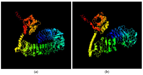 Prediction of TLR4 protein’s tertiary structure: (a) Full-length TLR4 protein; (b) Truncated TLR4 protein encoded by exon-2 deleted TLR4 transcript.