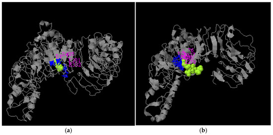 Functional templates were comprehensively scored using COACH [36] classification based on sequence and structure distribution alignment. The predicted structure and functional template (Table 4) of the full-length TLR4 protein’s ligand-binding site are depicted in Figure 6a. The C-Score or confidence score for predicted ligand binding sites ranged from 0–1. A higher C-Score indicates more reliable predictions. The first functional template (PDB ID: 3fxiA) showed a lower confidence score (C-Score = 0.05) for NAG peptide ligand binding. The ligand-binding site was Lys381, Arg382, Asp405, Asp428 residues. The structure of a ligand-binding site and a functional template (Table 5) of a predicted TLR4-truncated protein is depicted in Figure 6b. The first functional template (PDB ID: 2Z81A) contained a peptide with a lower confidence score for ligand binding (C-Score = 0.05). The binding ligand was 2Z81A00, and the ligand-binding site was Leu276, Lys277, Met278, Ala279, Thr299, Val300 residues. EC (enzyme classification) and active sites of predicted TLR4-truncated protein were identified using CO-FACTOR, whereas the global and local structure of known proteins were compared using the BioLip database and the I-TASSER model. The model’s structure and the active site are depicted in Figure 7a. EC number and PDB ID of the yak’s full-length TLR4 protein in the functional template are depicted in Table 6. This template was predicted to be IgA-specific serine endopeptidase with EC number 3.4.21.72; however, no active site residues were identified. Figure 7b demonstrates the model’s structure, the active site. Table 7 demonstrates the EC number and PDB ID of the truncated TLR4 protein in the functional template. The first model is based on PDB-ID: 2vkzG predicted template. This template was identified to be (Acyl-carrier-protein) S-acetyltransferase with EC numbers 2.3.1.38, and the Oleoyl-(acyl-carrier-protein) hydrolase with EC numbers 3.1.2.14; however, no active site residues were predicted.