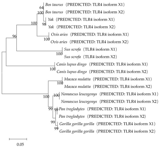 The phylogenetic tree constructed from the amino acid sequences of yak and other species established the close evolutionary relationship of yak with other cattle and distant evolutionary relationship with gorillas, in line with the previous studies. Amino acid sequence alignment of yak with other species elucidated 70–99% similarity between amino acid sequences from different species. It indicated that the TLR4 gene, which plays crucial roles in animals, remained highly conserved throughout the evolutionary process. Previous studies have shown a close correlation between TLR4 and diseases. For instance, missense mutations in TLR4 were associated with decreased reactivity to LPS in a minority population [47]. In chicken, TLR4 polymorphism was associated with susceptibility to Salmonella [48]. It further demonstrated the correlation of the TLR4 gene with immunity. Thus, in-depth research on the TLR4 gene might improve the host’s resistance to multiple disorders.