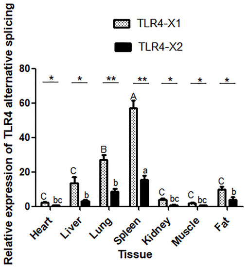Relative expression of two variants of TLR4 in different tissues. Note: * indicated that the expressions of TLR4-X1 and TLR4-X2 in the same tissue were significant difference, and ** indicated that the expressions of TLR4-X1 and TLR4-X2 in the same tissue were highly significant difference. A, B and C represent the significance of TLR4-X1 expression in different tissues, while a, b and c represent the significance of TLR4-X2 expression in different tissues.