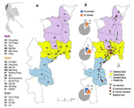 Study sites and geographic distribution of canine filariasis in three zones of Chiang Mai, Thailand. (A). The study districts; (B). Distribution of Brugia pahangi and Dirofilaria immitis positives and the proportion of prevalence of filarial nematode species in each zone.